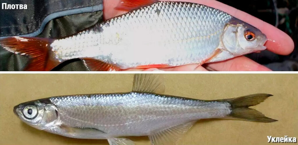 - Уклейка выглядит почти вдвое тоньше, мало весят. Даже крупные особи выглядят очень «худыми» при сравнении с плотвой.