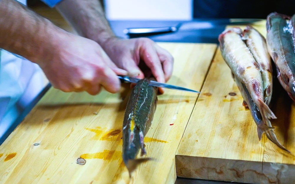 Выбранную тушку стерляди нужно разделать, предварительно окунув в горячую (70-80°С) воду, чтобы смыть с нее слизь: