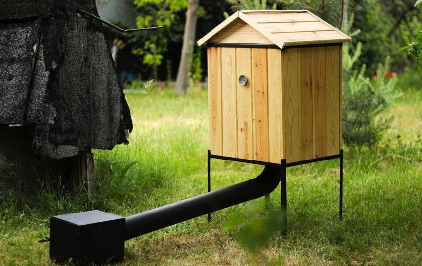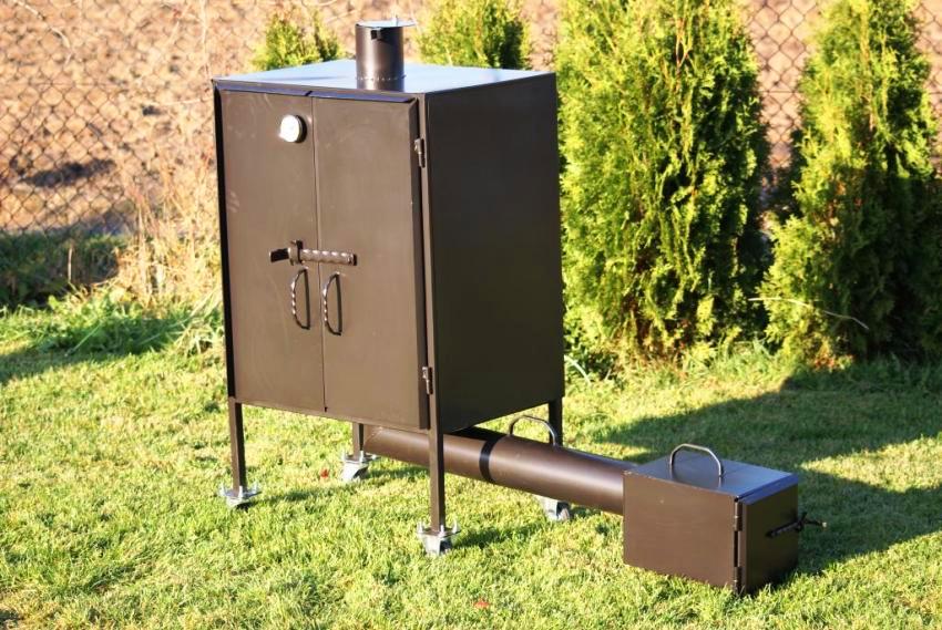 Конструктивно это обычная коптильня с дымогенератором. Отличие в длине подводящего дымохода. Он делается такой, чтобы дым не успевал остывать и поступал в коптильную камеру нагретый до необходимой температуры.