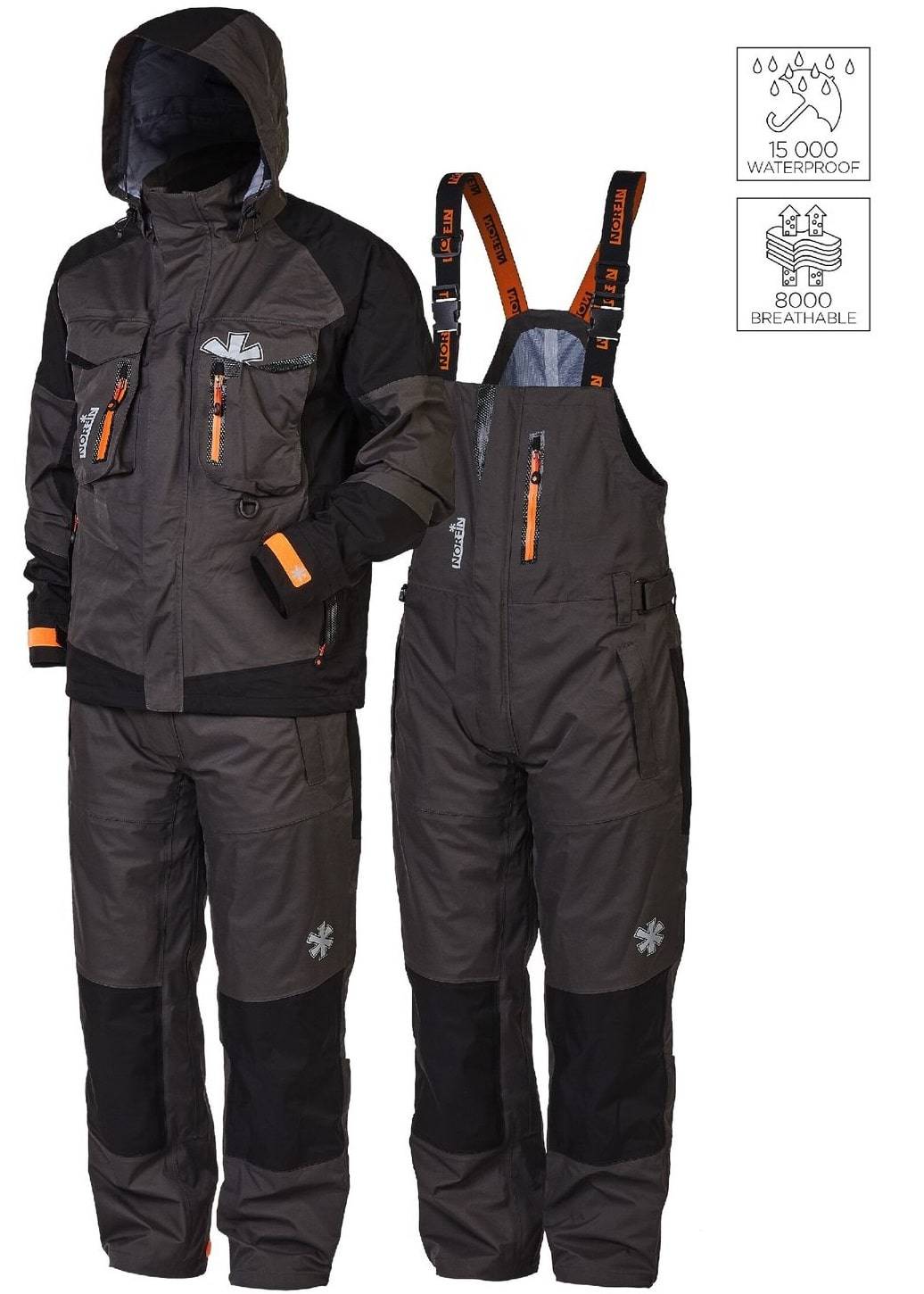 Бестселлером среди костюмов norfin для зимы считается Norfin Tornado. Это уникальный зимний костюм, который предназначен для эксплуатации в условиях холодной зимы, в период активного движения. Костюм можно использовать до -30, так как в качестве утеплителя используется тинсулейт. Это искусственный наполнитель, внутри которого имеется воздушное пространство, обеспечивающее хорошую теплоизоляцию. Куртка и комбинезон изготовлены из качественной мембранной ткани, которая покрыта прорезиненным слоем. Одежда защищает рыбака и охотника от проникновения влаги, промокания в условиях сильных ливней. Одежда отличается высокой водонепроницаемостью, которая равна 10 000 мм. Кроме того, комплект одежды позволяет телу дышать во время активного движения из-за высокого показателя паропроницаемости. Качественный пошив, проклеенные швы, а также наличие большого количества дополнительных карманов, облегчают жизнь рыбака или охотника. В костюме есть нагрудные флисовые карманы для согрева рук. Есть водонепроницаемый карман для хранения смартфона с прозрачной поверхностью. Это позволяет пользоваться телефоном, не вынимая его из кармана. Великолепный выбор для активных людей, которые не сидят на месте и предпочитают активную зимнюю рыбалку, охоту в тяжёлых погодных условиях.