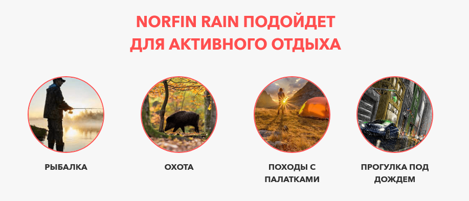 - Помощник в любую погоду. Практика применения является подтверждением того, как костюм NORFIN RAIN отлично спасает тело от проливных дождей. Это лучшее, что может оказаться у пользователя под рукой, когда на улице льет как из ведра, и когда даже зонт не поможет. Это в особой степени актуально для увлеченных охотников, рыболовов и обычных людей, например, спешащих на работу или отправившихся на велосипедную прогулку.