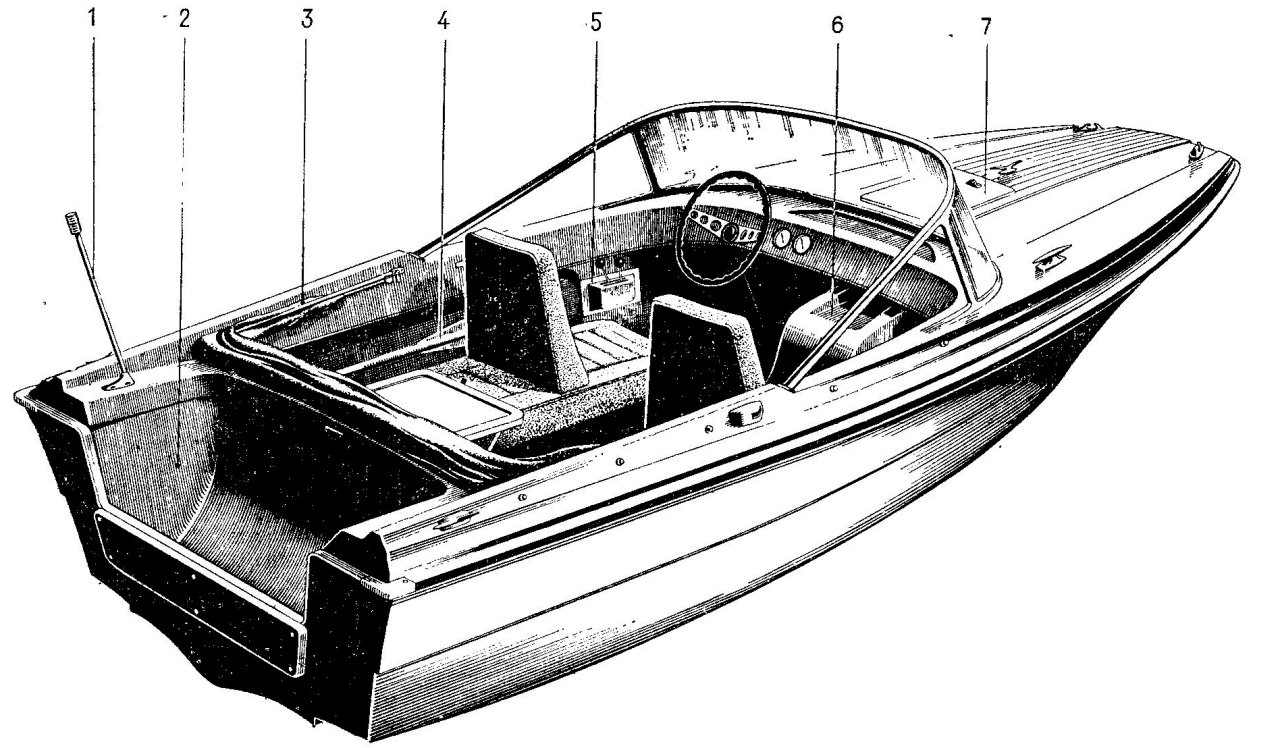 1 — треножный ходовой огонь; 2 — рецессия; 3 — быстросъемный тент; 4 — ход лопасти; 5 — пульт управления и дроссель; 6 – ниша для хранения мелочей; 7 — крышка люка на форштевне.