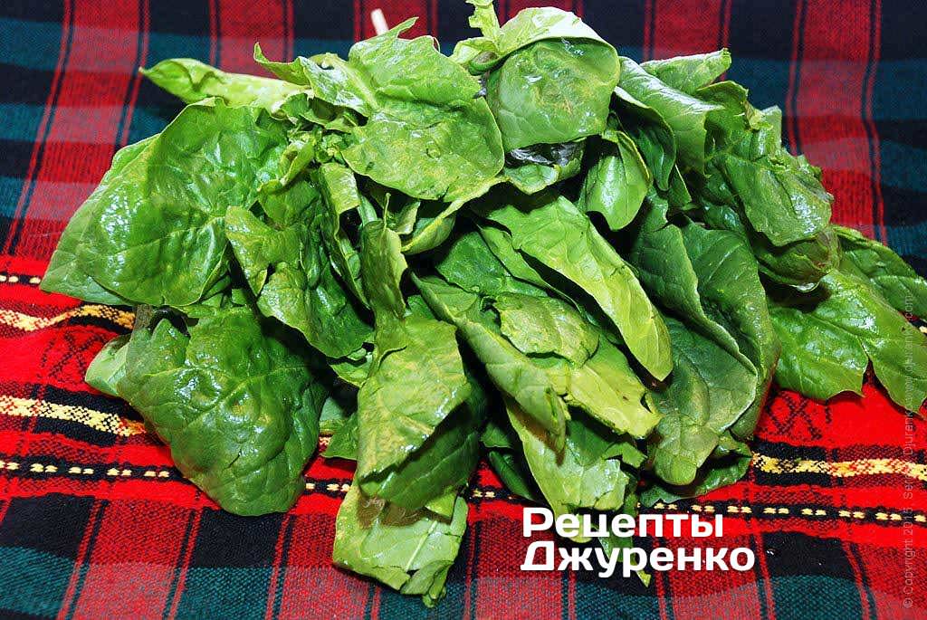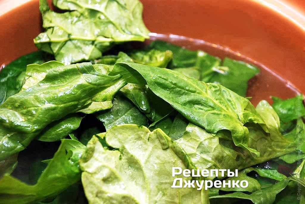 Зеленые листья шпината вымыть, перебрать, удаляя поврежденные листья и отрезая черешки.