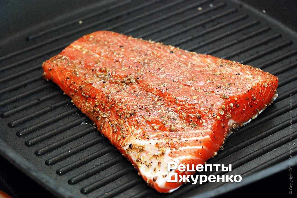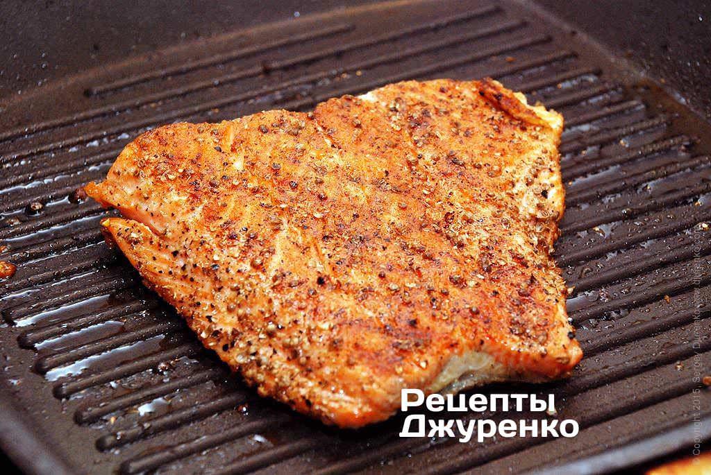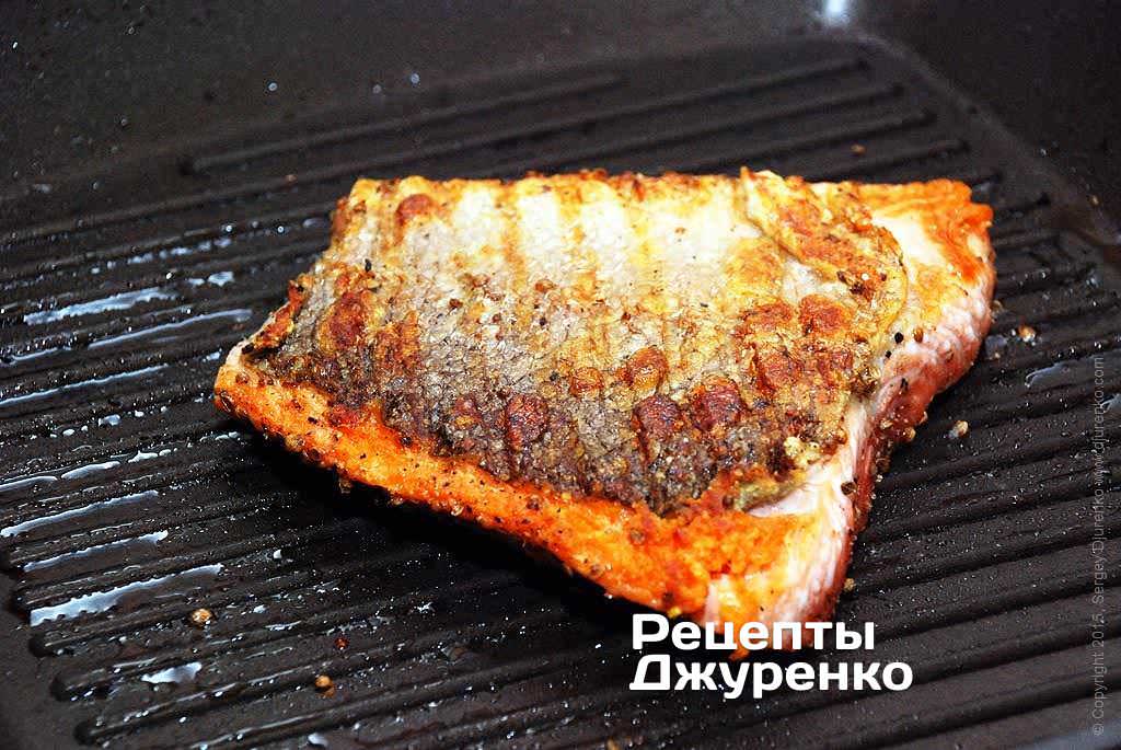 Рыбу положить на сильно разогретую сковородку-гриль кожей вниз. Жарить в течение 5 минут.