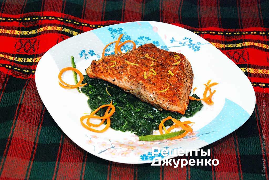 Рыба со шпинатом в сливочном соусе готова, можно подавать к столу. Приятного аппетита!