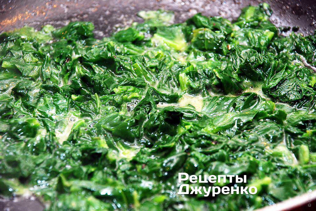 На сковородке растопить кусочек масла. Выложить в разогретое масло отваренный шпинат, посолить и поперчить по вкусу, но не сильно, и тушить под крышкой на маленьком огне до 10 минут.