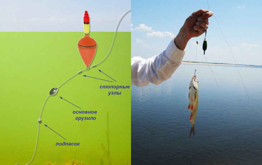 Огрузка распределённая или сконцентрированная вблизи поводка — в зависимости от силы течения. При ловле на глубине 3–4 м бывает достаточно одной неподвижно зафиксированной «оливки». Лёгкие насадки я нередко догружаю, ставя подпасок на поводок.