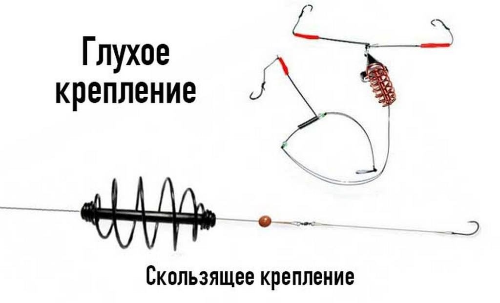 - Поводки крепятся не к самой пружине, а через специальный поводок. Смотрите на фото справа. Форма пружины позволяет легко и удобно забивать её кашей.