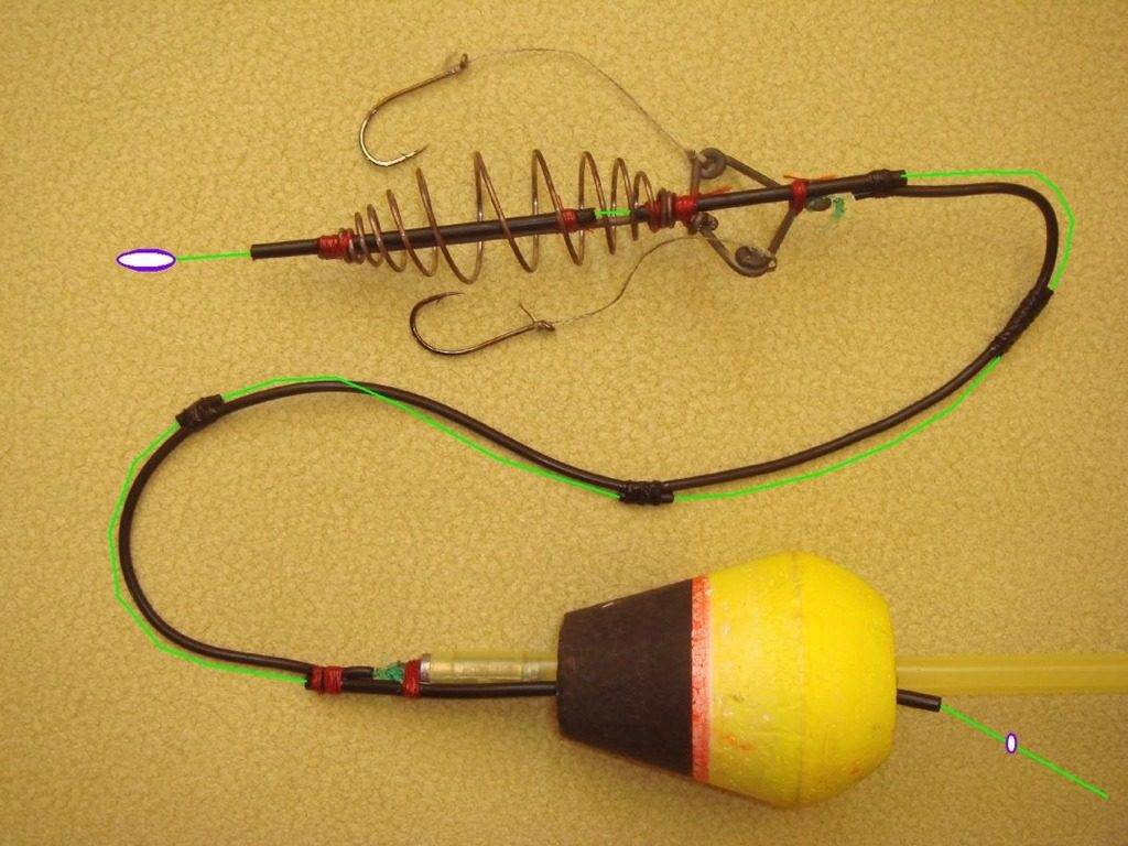 На изображении видно, что основная леска проходит сквозь поплавок. Если поплавок закрепить с помощью застежки, то получится более универсальная снасть. В случае использования только одного крючка, без коромысла, то можно получить более чувствительную оснастку.