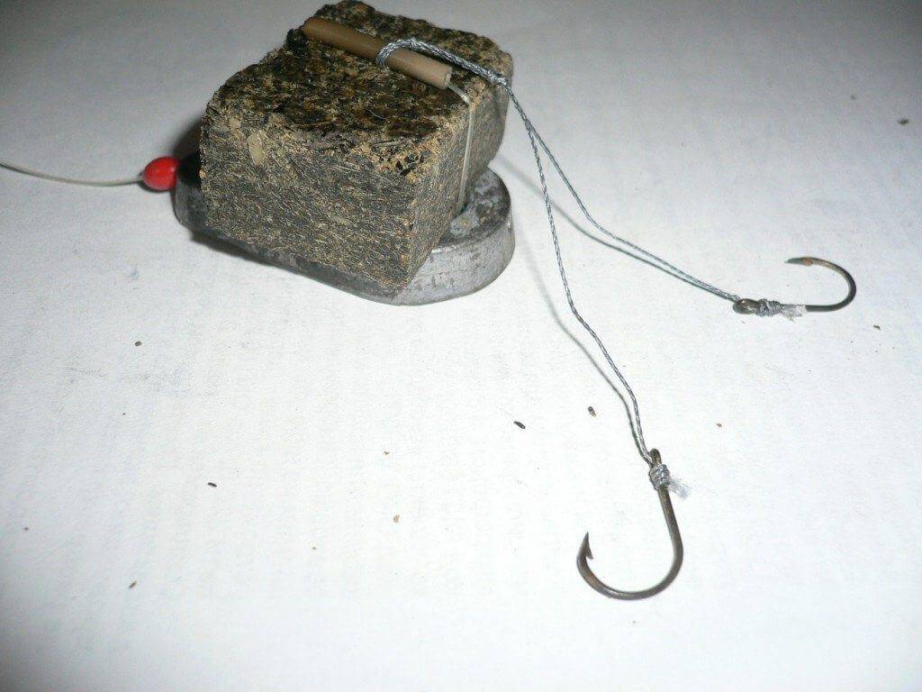 двойной поводок не перетер или не пережег леску). Затягиваем в петле из лески самозатягивающимся узлом кусок жмыха (предварительно сделав в нем ровно по середине надрез ножом или можно сделать пропил ножовкой по металу, это делается для того чтобы кубик прочно сидел в петле из лески) , втыкаем в него по краям крючки (чтобы они не перепутались между собой во время заброса) и все, наша снасть готова для заброса.