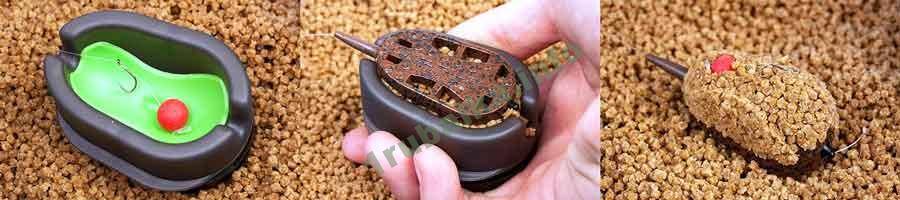 - Метод. Кормушка представляет собой решетку или рамку с одним или несколькими крючками с насаженной наживкой. Перед забросом это изделие со всех сторон облепливается приманкой. Карп, в попытках поймать распадающуюся приманку, вместе с ней затягивает в рот и крючок;