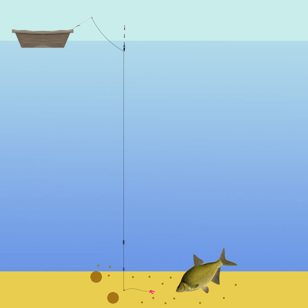 - Глубина — бортовая удочка предназначена рыбалки на глубине от трех метров. При меньшей лещ просто не будет находиться под лодкой, а значит заброс в отвес не будет особо эффективным.