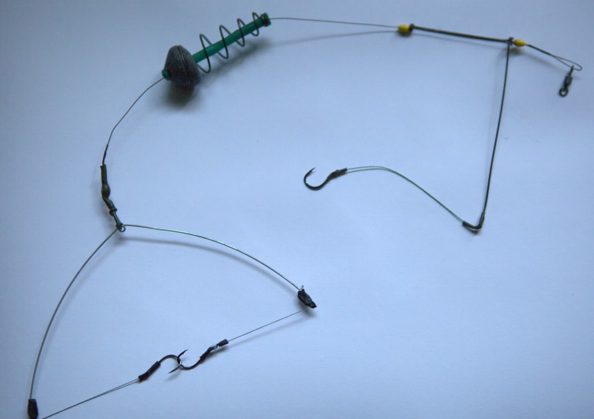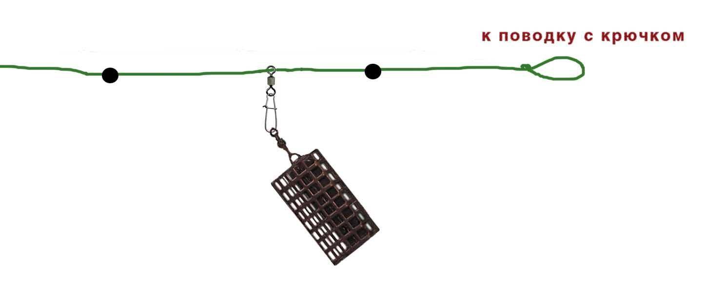Основной принцип монтажа снасти заключается в том, что необходимо закрепить оснастку на дне под лункой с помощью тяжелой кормушки, а поводок с крючками и насадкой отпустить по течению, от 2 до 6 метров, иногда даже дальше. Поэтому на основной леске монтируется кормушка по принципу патерностера, но с возможностью передвижения. Реализуется это при помощи резиновых стопорков с двух сторон скользящей петли (или вертлюжка) поводка кормушки. Это нужно для изменения длины рабочей части с крючками при необходимости. Выполнить данный узел можно любыми методами, главное, чтобы кормушка двигалась.
