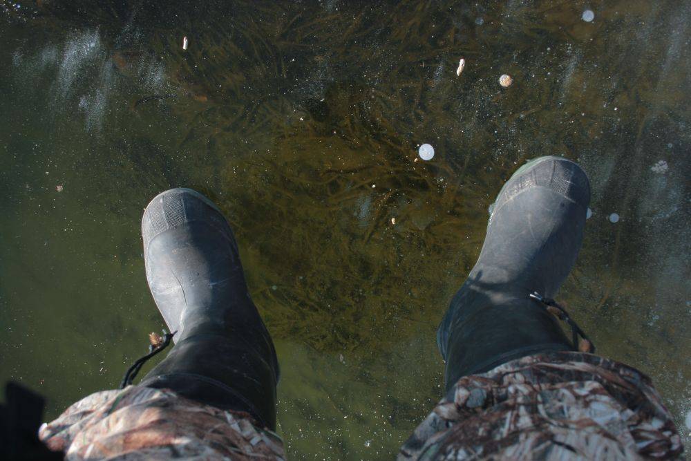 В зависимости от характера дна и подводной растительности лунки сверлят вдоль границы береговой растительности, либо от берега в глубину.