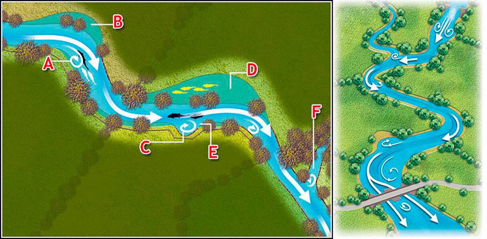 На небольших речушках особое внимание стоит обратить, конечно же, на глубокие участки на поворотах – омута, выходы и входы в них. Именно в таких местах отстаивается крупная рыба в течение дня и выходит в определенное время на охоту