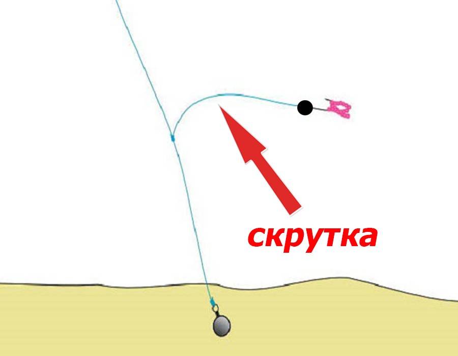 И в низу толстой лески находится грузик. Грузик позволяет быстро утопить снасть. А ловить вы будете на мормышку, которая прикреплена к скрутке. Мормышка должна быть практически невесомая (шарик меньше 2 мм в диаметре).