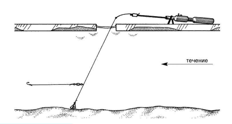 При наличии сильного течения, которое не дает комфортно ловить на поплавочку или мормышку, используется удочка с более мощным кивком. На конец такой зимней снасти лучше смонтировать вариант из фидерных монтажей в мини-исполнении — патерностер,несимметричную петлю, инлайн. Такая снасть с отводным поводком позволит ловить зимой на крупных реках с сильным течением.