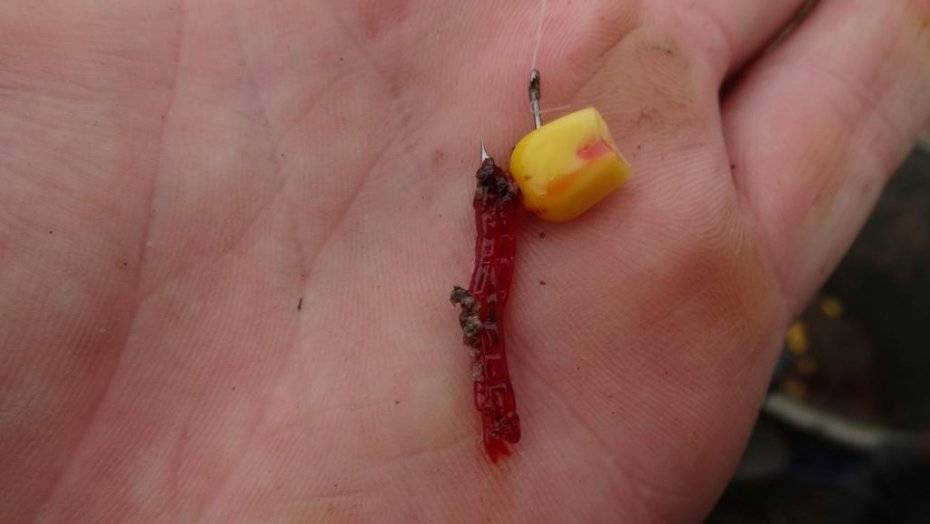 Иногда на крючок к червям добавляют кукурузу или пареный горох, что тоже неплохо сказывается на клеве сазана.