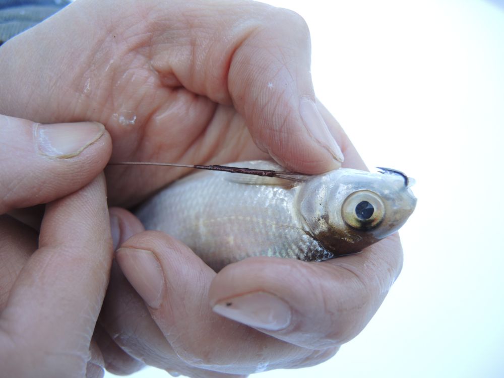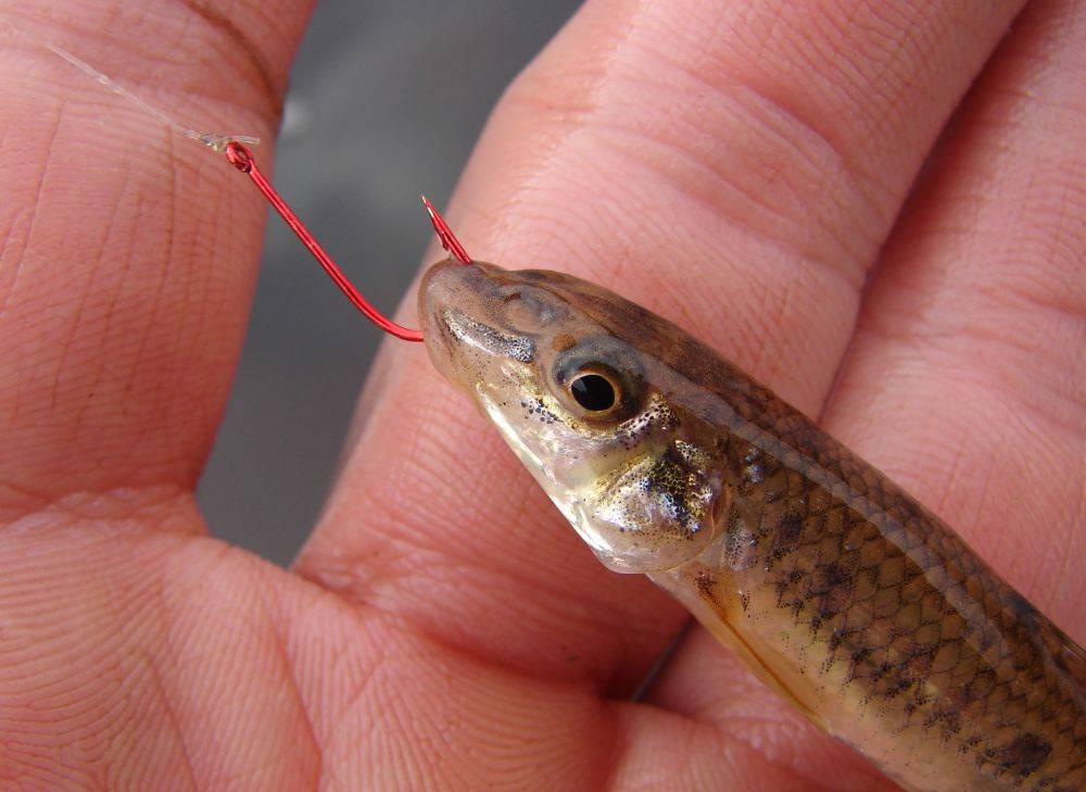 Для поплавочной ловли окуня, я считаю, самый оптимальный живец – это небольшой пескарь или верховка (фото 8). Подойдет также небольшая плотвичка или красноперка. Как правило, малька для ловли полосатого мы цепляем под губы (фото 9). В таком положении живчик долгое время остается подвижным и активным.