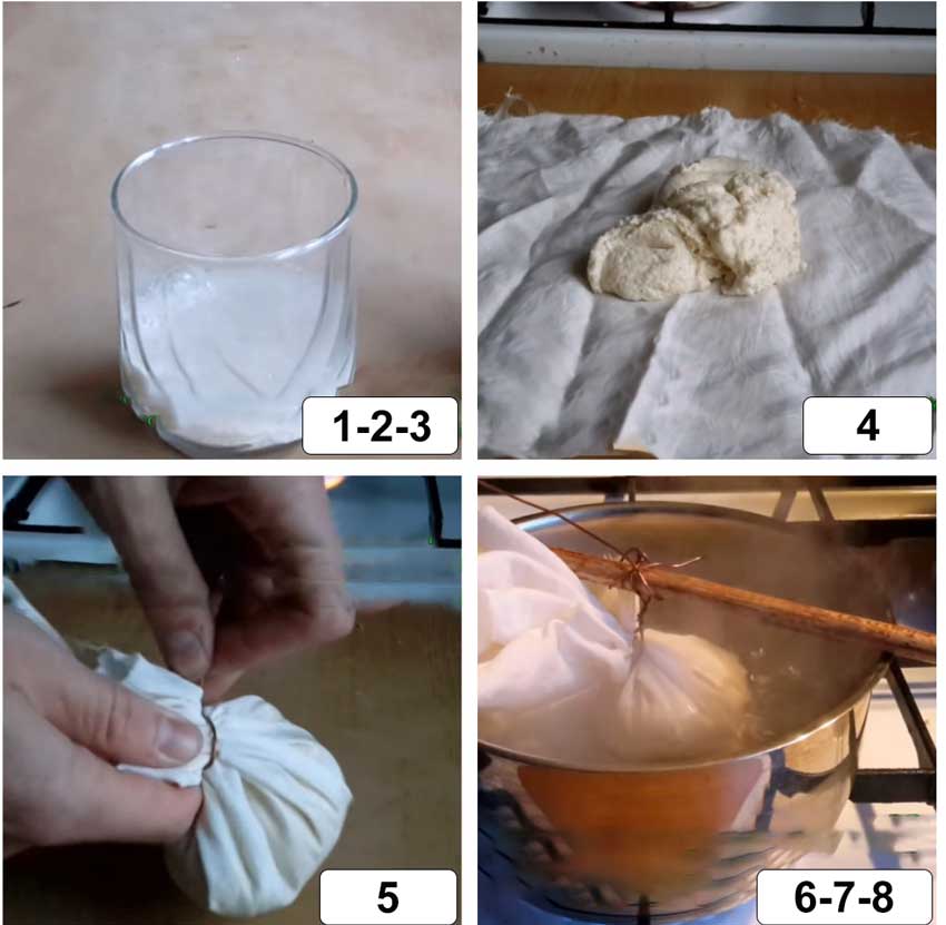 - когда из крупы выйдет весь крахмал и вода приобретёт мучнистый цвет – насадка готова. Разрезаем шпагат и собираем оставшуюся клейковину.
