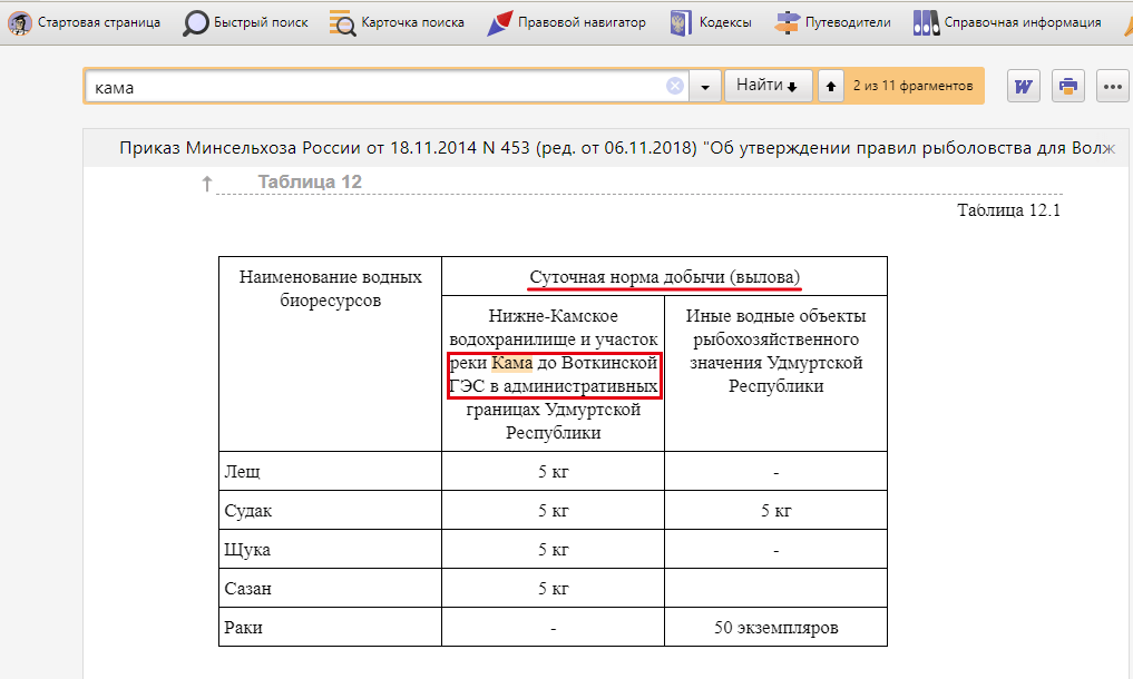 Кроме нормативно установленной длины на реке Кама до Воткинской ГЭС установлена дневная норма улова – 5 кг для следующих видов водных ресурсов: лещ, судак, щука, сазан.