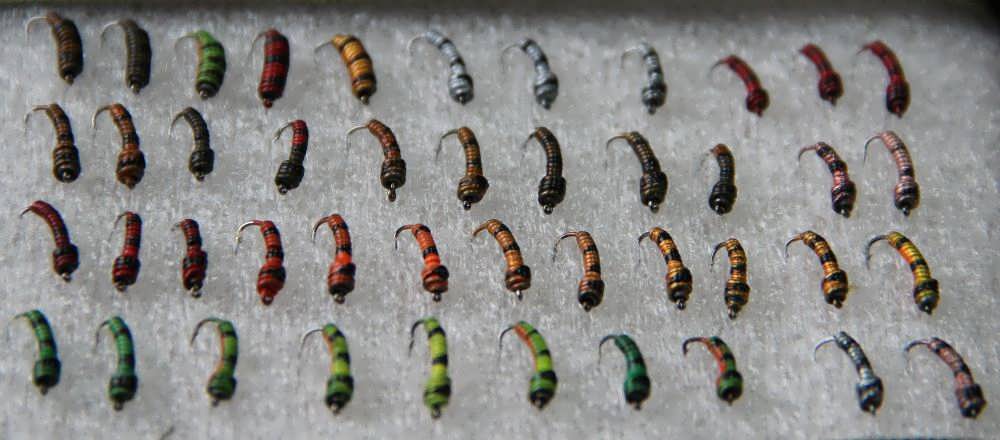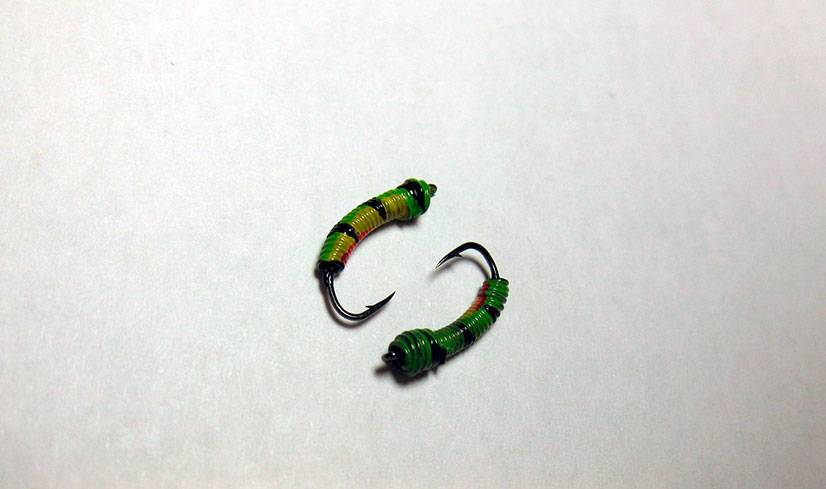 При подледном лове используются летние мушки, при этом вяжут самые маленькие их варианты, оснащенные необычайно острыми крючками. Если применяют харьюзовые мушки, то их необходимо снабдить бусиной из латуни. Цвета желательно выбирать наиболее естественные, зеленого или оливкового оттенка.