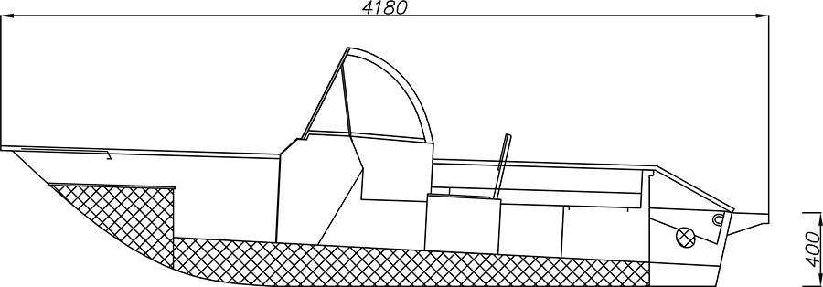 Толщина листа днища составляет 3 мм, бортов – 2 мм. Корпус плавсредства дополнительно усилен трубой привального бруса и также металлическими угольниками на носу и планширем по бортам.