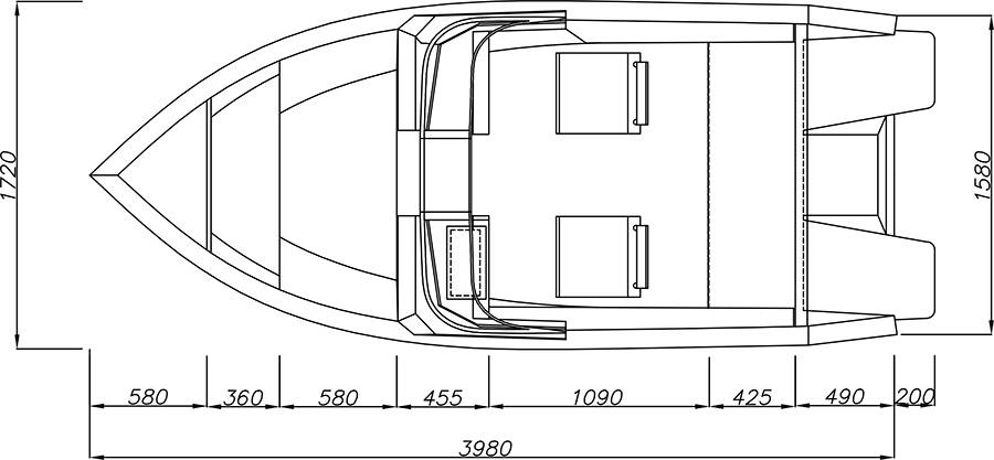 Передняя панель расположена на некотором возвышении, переходящим в фальшборт, укрывающий передних пассажиров. Кокпит защищен ветровым стеклом из поликарбоната в алюминиевой раме. Стекло сплошное, гнутое. На переднюю палубу можно попасть только или перешагнув через него или перекидывая ногу через борт. Отсутствие деления стекла на секции делает более удобным обзор, но внешний вид катера становится при этом простоватым. За передней панелью установлены поворотные кресла. Под кормовым диваном размещены отсеки для АКБ, топливного бака и багажного отделения. В кормовой зоне катера есть две площадки у моторного отсека. Транец изготавливается как под короткую, так и под длину «ногу».