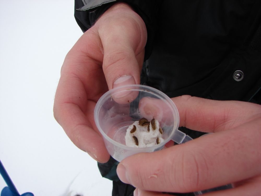 Если нет возможности сохранить приманку дома, рыбаки ее замораживают. Перед ловлей дают ей подтаять. Однако это не очень эффективно, потому что рыба предпочитает живую наживку.