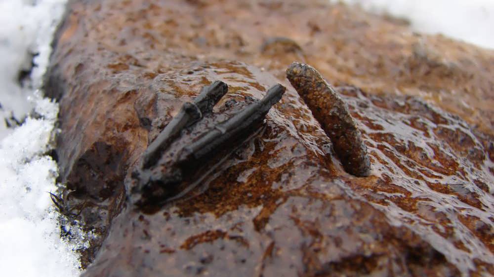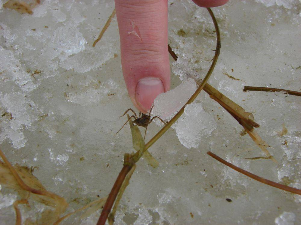 Определив мелководный участок с подводной растительностью (либо рядом с берегом, либо если на поверхности льда видны выступающие части травы и камыша), бурим лунку и, опустив в неё шнек, несколько раз качаем им вверх-вниз и затем резко выдергиваем бур. Поднятый придонный слой вылетает из лунки вместе с растительностью (фото 25), с которой мы и собираем этих рачков.