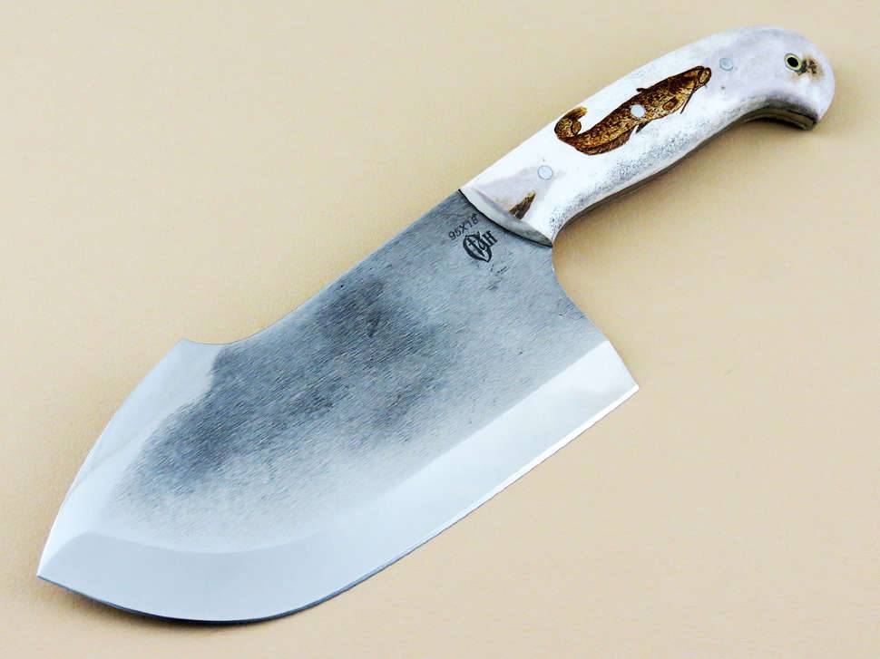 - Разделочный — короткий клинок с толстым обухом, напоминающий топорик. Хорошо строгает рыбу и разделывает тушу поперек.