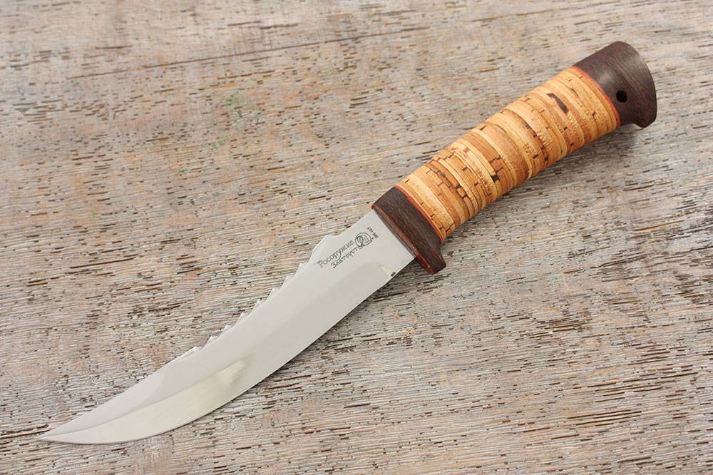 - Нож «Заноза» – универсальный инструмент и для рыбаков, и для охотников. Клинок шириной 18 мм и толщиной – 2,4 мм произведен из стали 100×13. Удобная рукоятка выполнена из бересты. Ножом такой модели легко разделывать как рыбу, так и водоплавающую дичь.