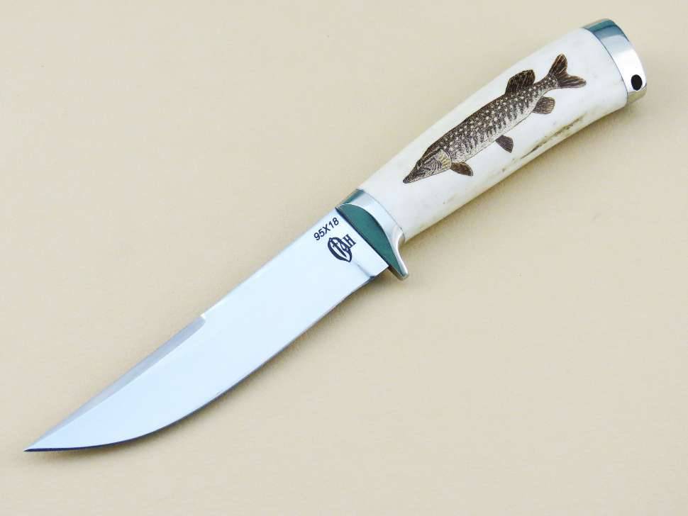 - Нож «Пескарь» – легкий прочный инструмент средних размеров. Острым лезвием легко разрезать любую рыбу. Клинок изготовлен из стали 95×18. Толщина клинка составляет 2,4 мм. Обух у острия приспущен.