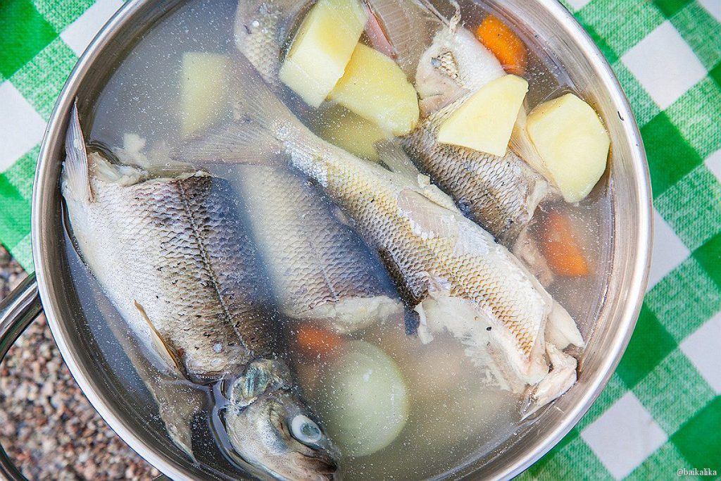 Ингредиенты: на одну рыбину небольшого размера потребуется литр воды, 3 картофелины, крупная морковка, луковица средних размеров. А ещё соль, перец, три лавровых листа, свежая мелко порезанная зелень.