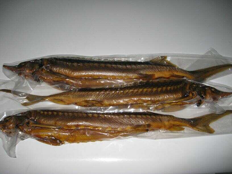 Осетрина горячего копчения тоже можно приготовить целиком. Такая рыба очень эффектно смотрится на столе. Но не всегда удается найти курильщика подходящего размера, поэтому очень часто с тушки удаляют голову и хвост, а внутренние части удаляют через продольный разрез на брюшке. При желании также устраняют разрастания костей.