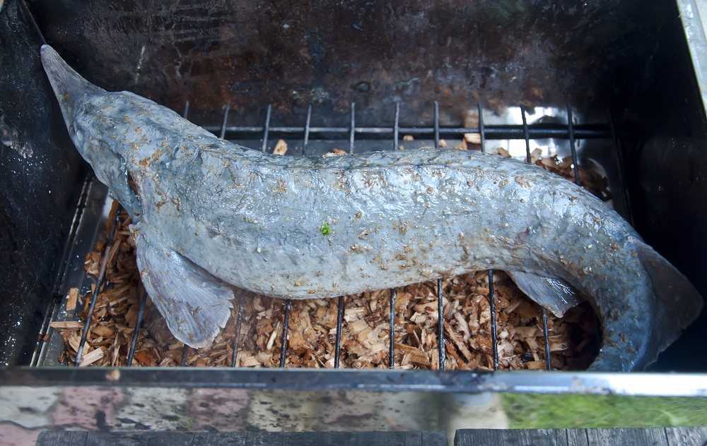 - Примерно через 5 минут убирают угли. Стерлядь снова накрывают крышкой и дают ей настояться ещё минут 10 (без горения щепы). Таким образом избавляются от излишков жира.