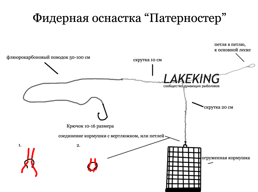 - После полной связки всех петлей патерностера можно вставлять кормушку и начинать прикармливание. Крепление кормушки делается методом накидки. Петля вставляется в ушко кормушки, полностью вытягивается и накидывается на тело кормушки. Затем леска затягивается и кормушка плотно закреплена в петле.