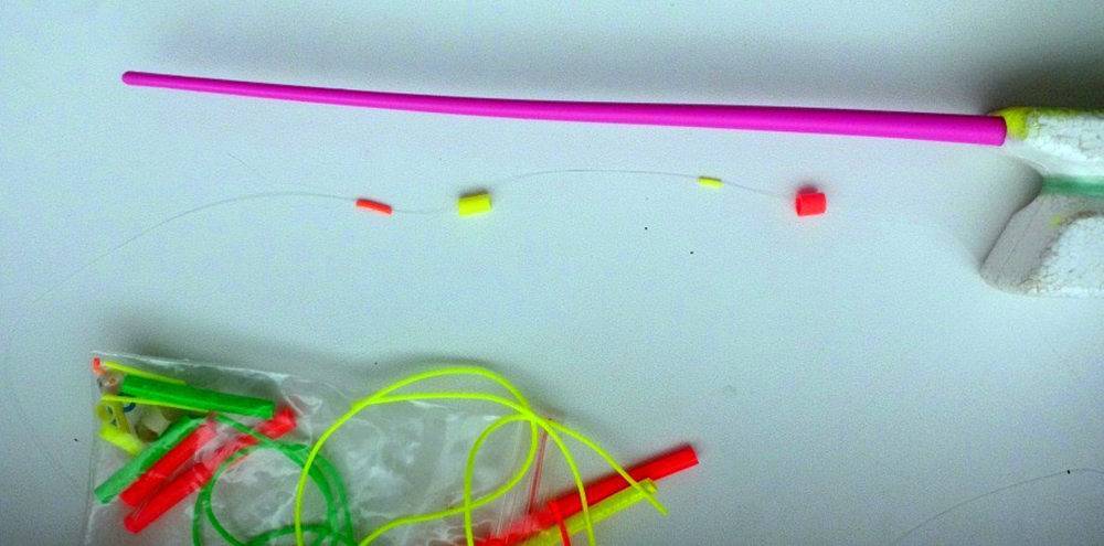 Два отрезка длиной 0,5 и ,1,5 сантиметра с диаметром отверстия около 1 мм служат в качестве пропуска лески. Два других, фиксируют их на разных частях шестика.