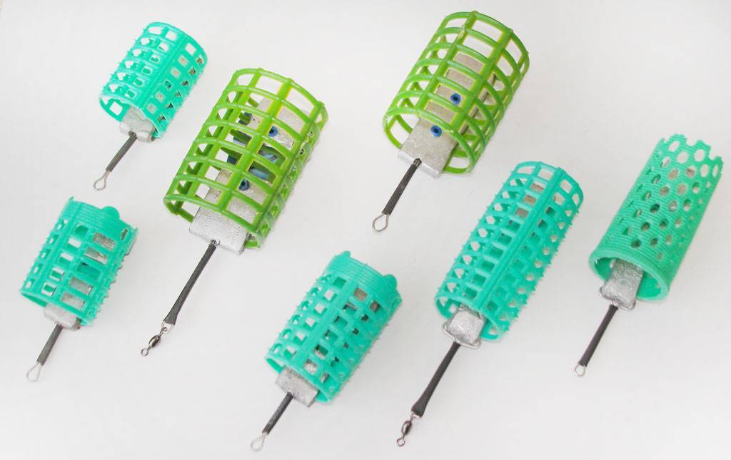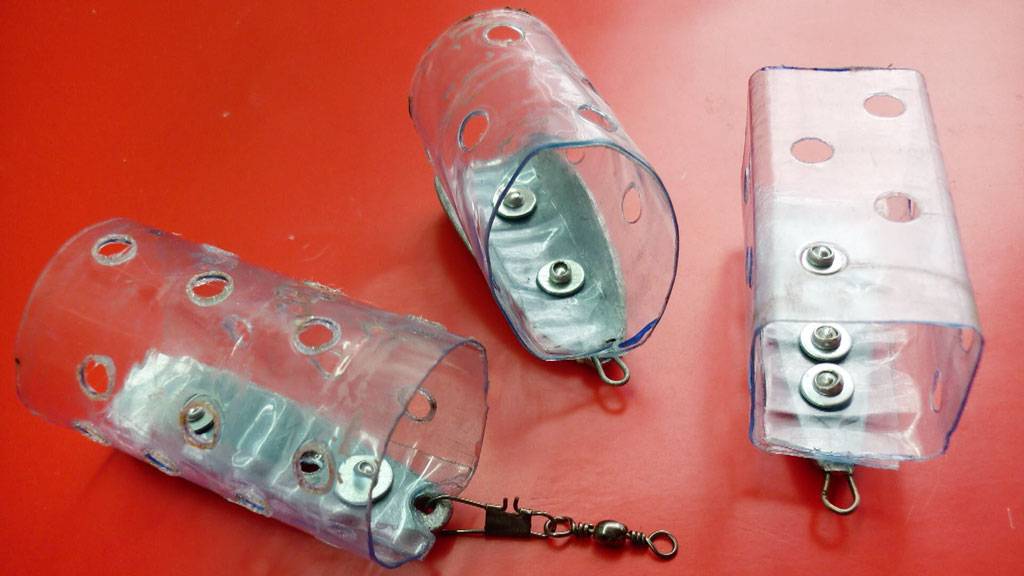 Также делают фидерные кормушки из старых дамских бигуди или вырезают нечто подобное из пластиковых бутылок. Прямоугольную заготовку из пластика прорезают в нескольких местах, формируя отверстия. Сворачивают пластинку в трубочку. Конструкцию фиксируют пластиковыми палочками, края которых нагревают и расплющивают. На эти фиксаторы сразу устанавливают свинцовую пластину в качестве грузила. К ней заранее припаивают колечко для монтажа оснастки. Получается не хуже магазинных кормушек.