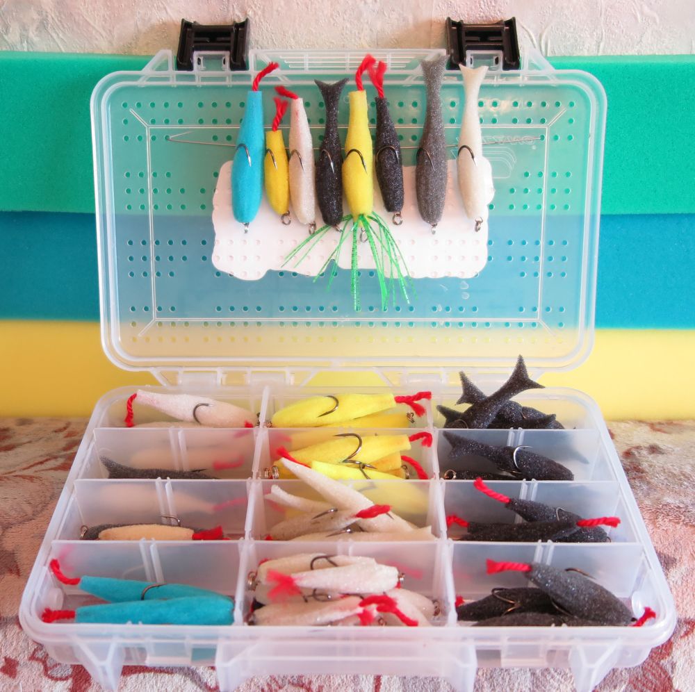 - небольшой вес — поролон имеет небольшой вес. Изготовленные из него приманки хорошо работают на неглубоких местах. Коробка с ними будет весить значительно меньше, чем с воблерами или блеснами;
