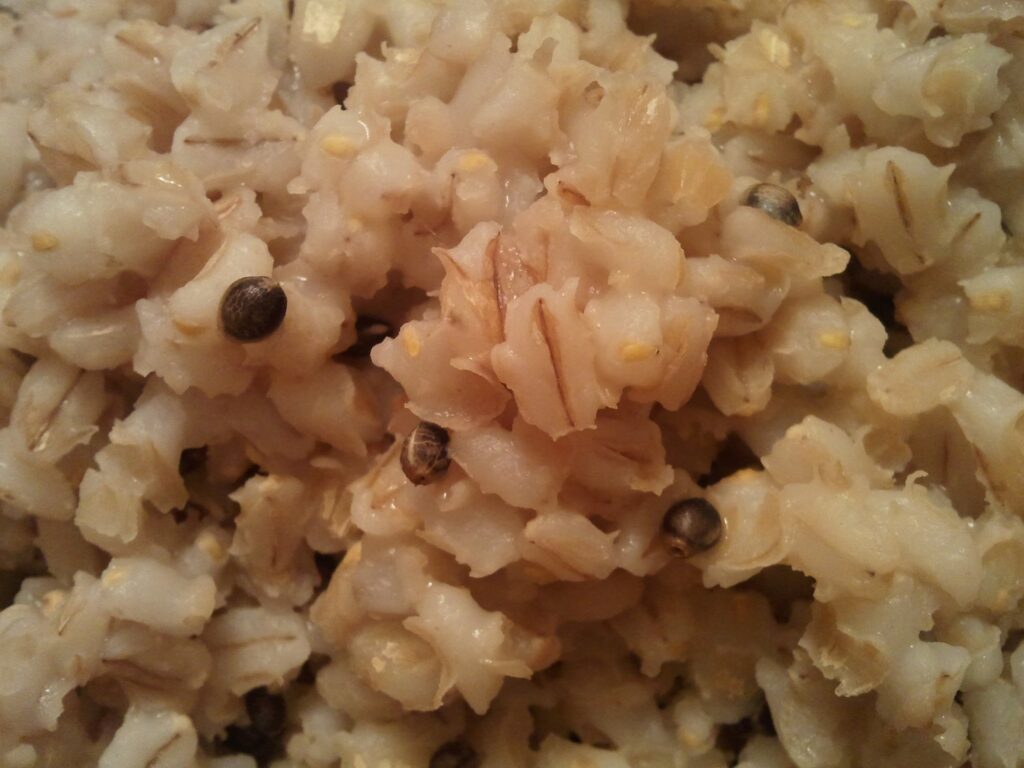 Запариваем перловку, в нее добавляем семена льна и сгущенку. Перемешиваем, добавляем животные компоненты. Ароматизатор, в данном случае, чеснок. На берегу совершенствуем грунтом.