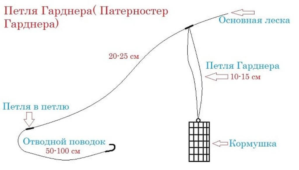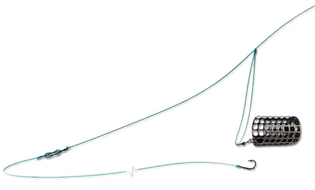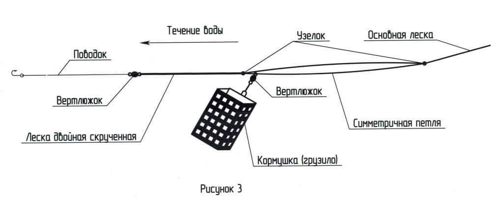 Отматывается 500 мм нити, которую нужно сложить пополам. На концах монтируется петля 20-30 мм. Один конец ставят вертлюги карабин, который соединяют с основной леской узлом. На карабине монтируют кормушку. Петля должна получиться в размере, примерно 200 мм.