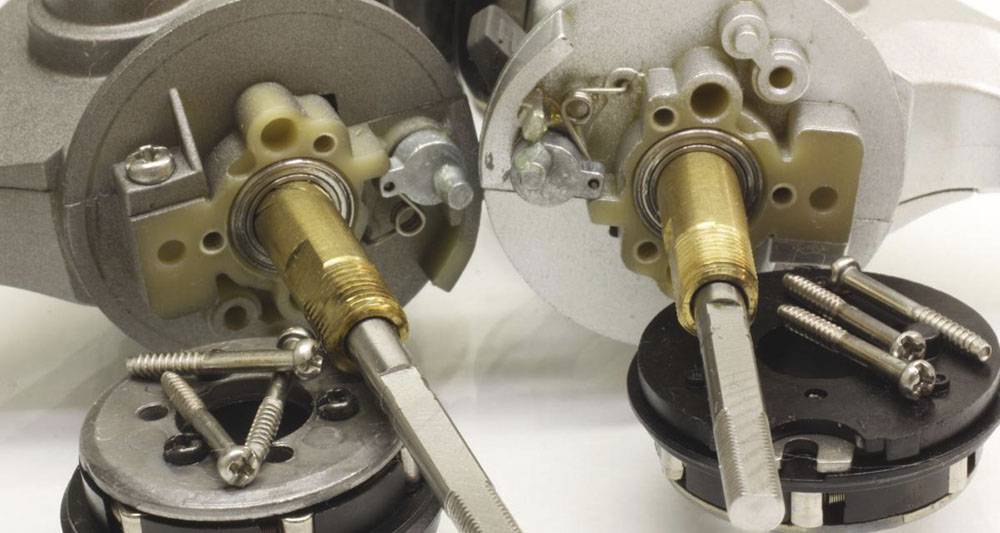 Для этого вначале нужно открутить болт рычага обратного хода и снять тумблер. Откручиваем отверткой болт заглушки и снимаем ее. Аккуратно снимаем стенку катушки. Возможно, потребуется ее подцепить плоской отверткой или пинцетом. Перед нами открылся главный механизм изделия. Его основные составляющие детали – бегунок и пара шестеренок, которые отвечают за вращение В случае если он функционирует нормально и доступ к нему был открыт с целью профилактического осмотра, дальнейшая разборка не требуется