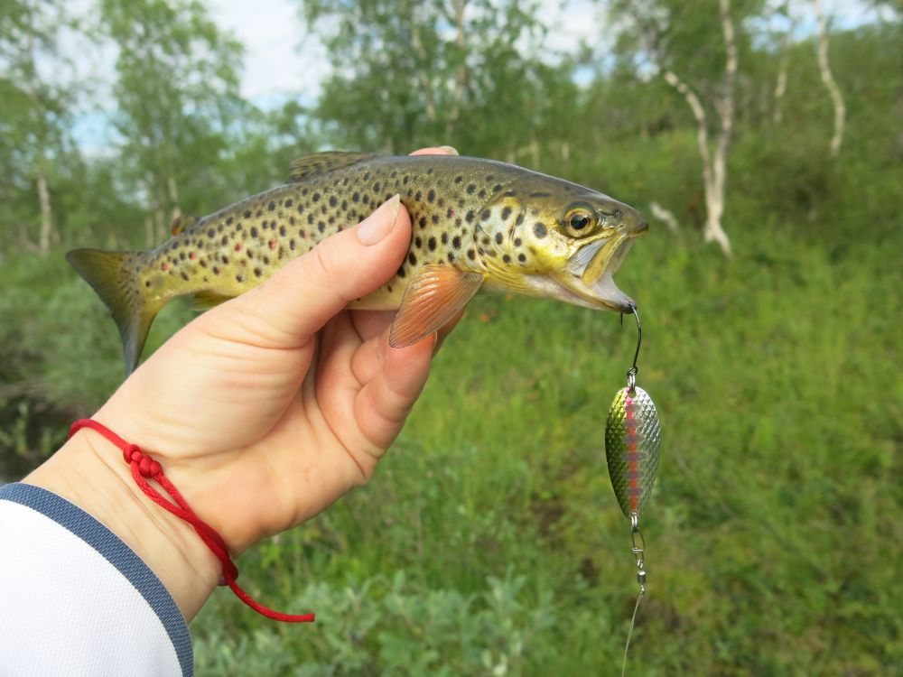 Настал черёд «Кочерги». Плёс спокойный – самое для неё место. Блесна полетела за камень. Я подождала три секунды, чтобы блесна спиралькой опустилась – и начала медленную проводку. Но полноценно довести её не получилось – кумжа с моей «Кочергой» уже неслась вверх к перекату. По ощущениям – некрупная, но бойкая.
