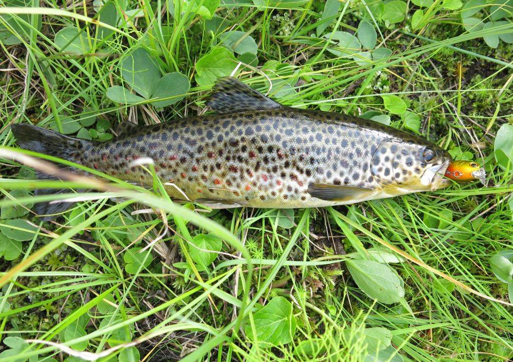 За перекатом раскинулся спокойный плёс с одиноким камнем. Пропустить такое место нельзя. Да и открытые берега обеспечивали комфорт для забросов. Сначала посмотрим, что под ногами. Короткие забросы под небольшую струйку косопузым воблерком «Камион» принесли симпатичных кумжачков в элегантных черных пятнышках. Пора укрупняться. Ставлю Drop Dia. Заброс перед камнем, неспешная поверхностная «равномерка». И яростная поклевка! На солнце сверкнуло ярко-красное золото. Точь в точь как вчерашняя!