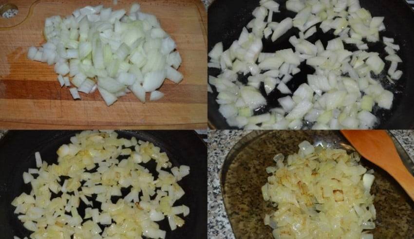 - Маленькими кусочками порезать лук, жарить его до прозрачности.