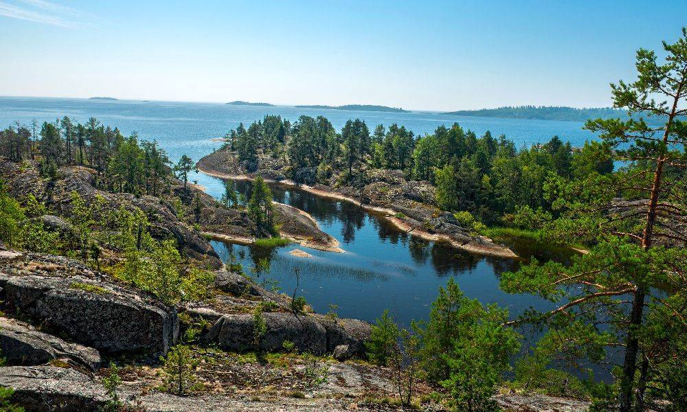 Очень богат подводный и прибрежный мир Ладоги. Его берега окружает тайга с богатым ельником, в то же время большое количество островов, число которых составляет 660, имеют скальные берега со скудной растительностью.