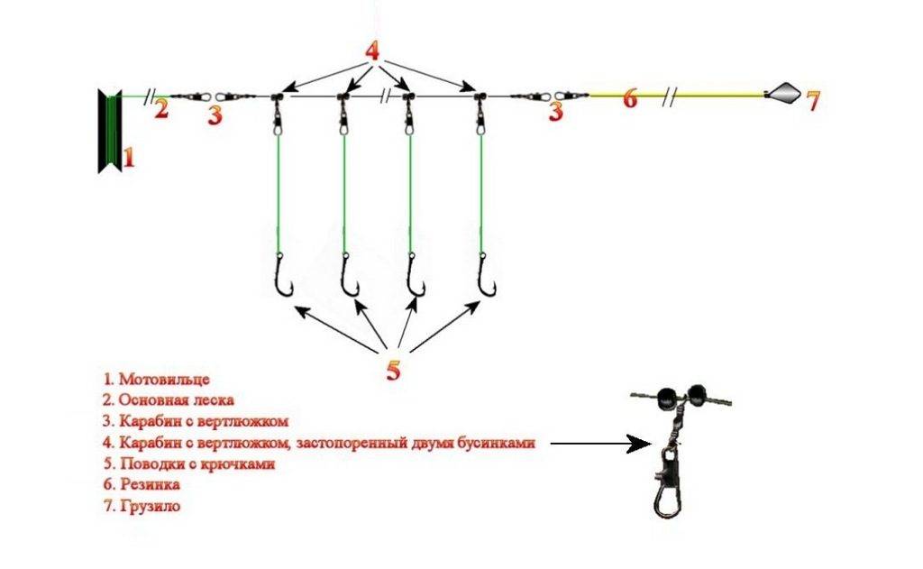 - Резинка соединяется с леской обязательно через вертлюг, чтобы избежать запутывания и скручивания снасти.