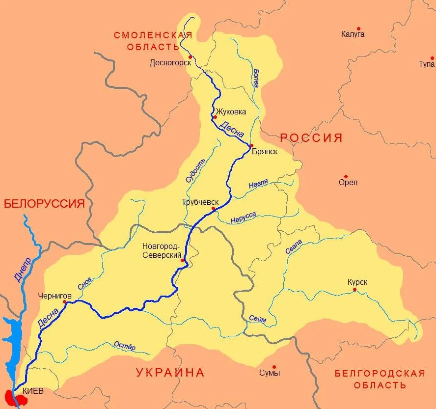 Река на карте проходит через несколько регионов европейской части РФ. Десна находится в Брянской обл., а также в Смоленской. В Украине путь лежит через Сумскую, Киевскую, Черниговскую области.