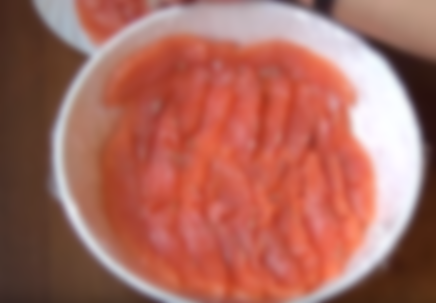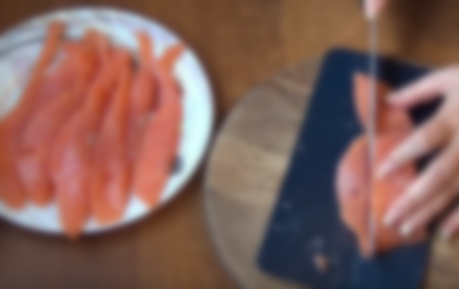 - Копчёную красную рыбу (415 грамм) нарезаем тонкими слайсами.